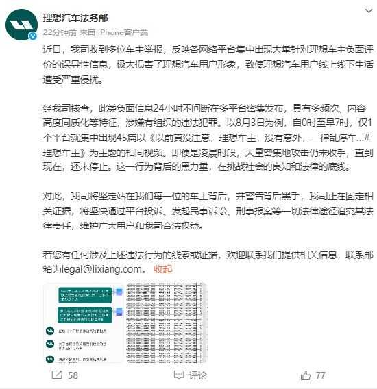 8月7日理想汽车法务部官方微博发文称,近期收到多位车主举报,反映各网络平台集中出现大量针对理想车主负面评价的误导性信息,极大损害了理想汽车用户形象,致使理想汽车用户线上线下生活遭受严重侵扰。