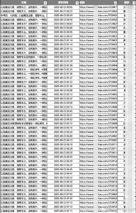 文章指出,经核查,此类负面信息24小时不间断在多平台密集发布,具有多频次、内容高度同质化等特征,涉嫌有组织的违法犯罪。以8月3日为例,自0时至早7时,仅1个平台就集中出现45篇以《以前真没注意,理想车主,没有意外,一律乱停车…#理想车主》为主题的相同视频。即便是凌晨时段,大量密集地攻击仍未收手,直到现在,还未停止。这一行为背后的黑力量,在挑战社会的良知和法律的底线。