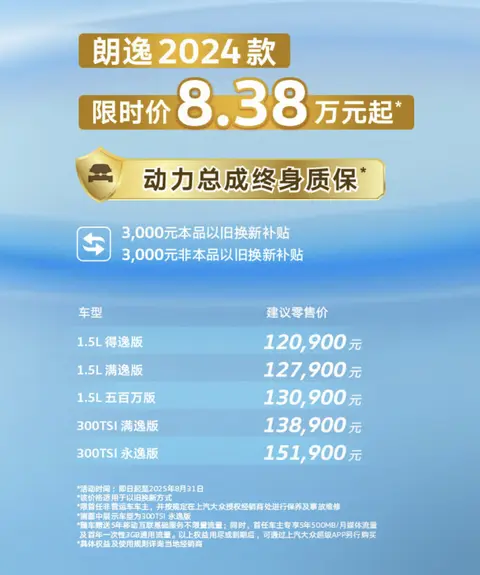 [懂车帝原创 产品] 日前,我们从上汽大众官方获悉,即日起至今年8月31日,2024款朗逸(图片|配置|询价)推出最新购车政策,包含限时价为8.38万元起(该价格适用于本品以旧换新方式),并可享受动力总成终身质保、3000元本品以旧换新补贴、3000元非本品以旧换新补贴等权益。作为参考,目前在售2024款朗逸指导价格区间为12.09万-15.19万元。