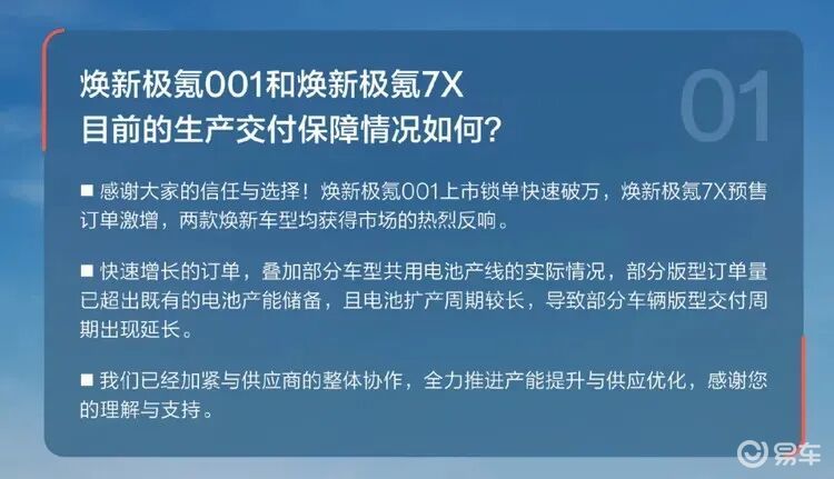 根据极氪的补充说明,由于焕新极氪001和焕新极氪7X的订单快速增长,加之部分车型共用电池生产线,超出既有的电池产能储备,预计交付时间会延长,再加上电池产能扩产周期比较长,导致部分车型的交车周期不得不延长。而且极氪还建议刚需用车的用户可以优先考虑极氪7X的75kWh神盾金砖电池版本……