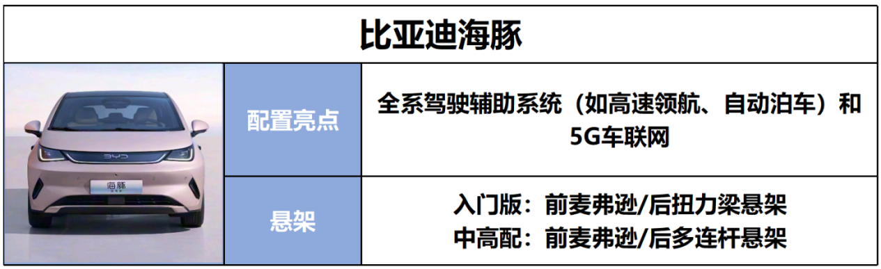 比亚迪海豚的配置相对均衡,做工质感也不错的,辅助驾驶系统可以说是它的亮点,可以实现高快领航以及智能泊车功能。但是指导价10万以下的车型,采用的后扭力梁的悬架,指导价超过10万的车型才配有前麦弗逊后多连杆悬架,所以预算10万以下买海豚,驾驶体验和乘坐乘坐舒适性就没那么好了。