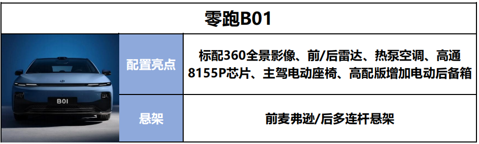 家用纯电小车的配置是否丰富,直接关系到平时使用的便利度,而悬挂的表现怎样直接关系到驾驶体验以及乘坐舒适性。零跑B01配置起点是比较高的,哪怕入门版,像360全景影像、前后雷达、主驾电动座椅、高通8155芯片车机这些很实用的配置都给了。360影像和倒车雷达对一些新手司机尤为重要,行车更安全,8155芯片使得车机更流畅,也更智能。而且零跑B01入门版车型也是采用前麦弗逊后多连杆独立悬架,开起来更稳,有更好的驾驶体验,特别是过沟过坎的时候乘坐舒适性也会更好。
