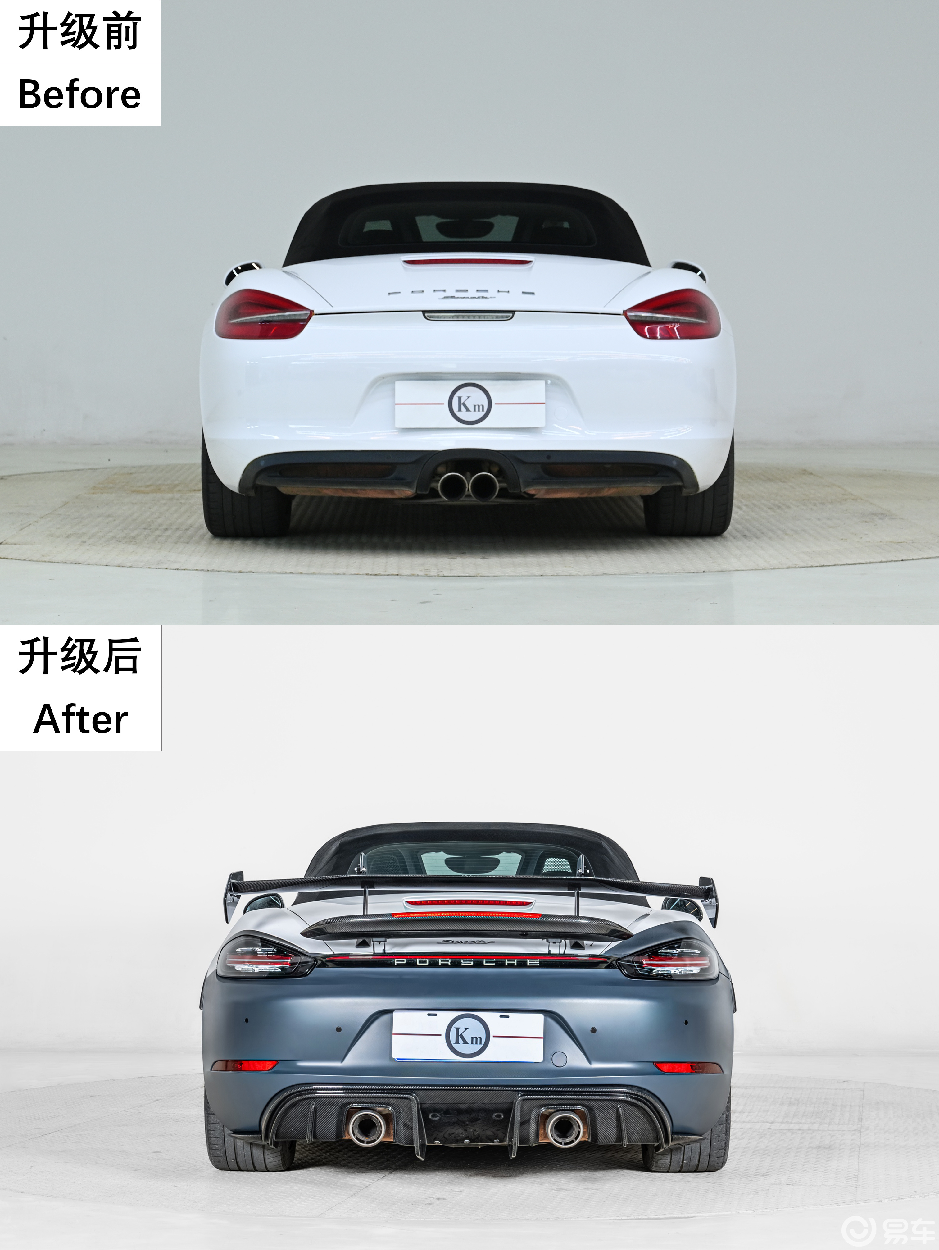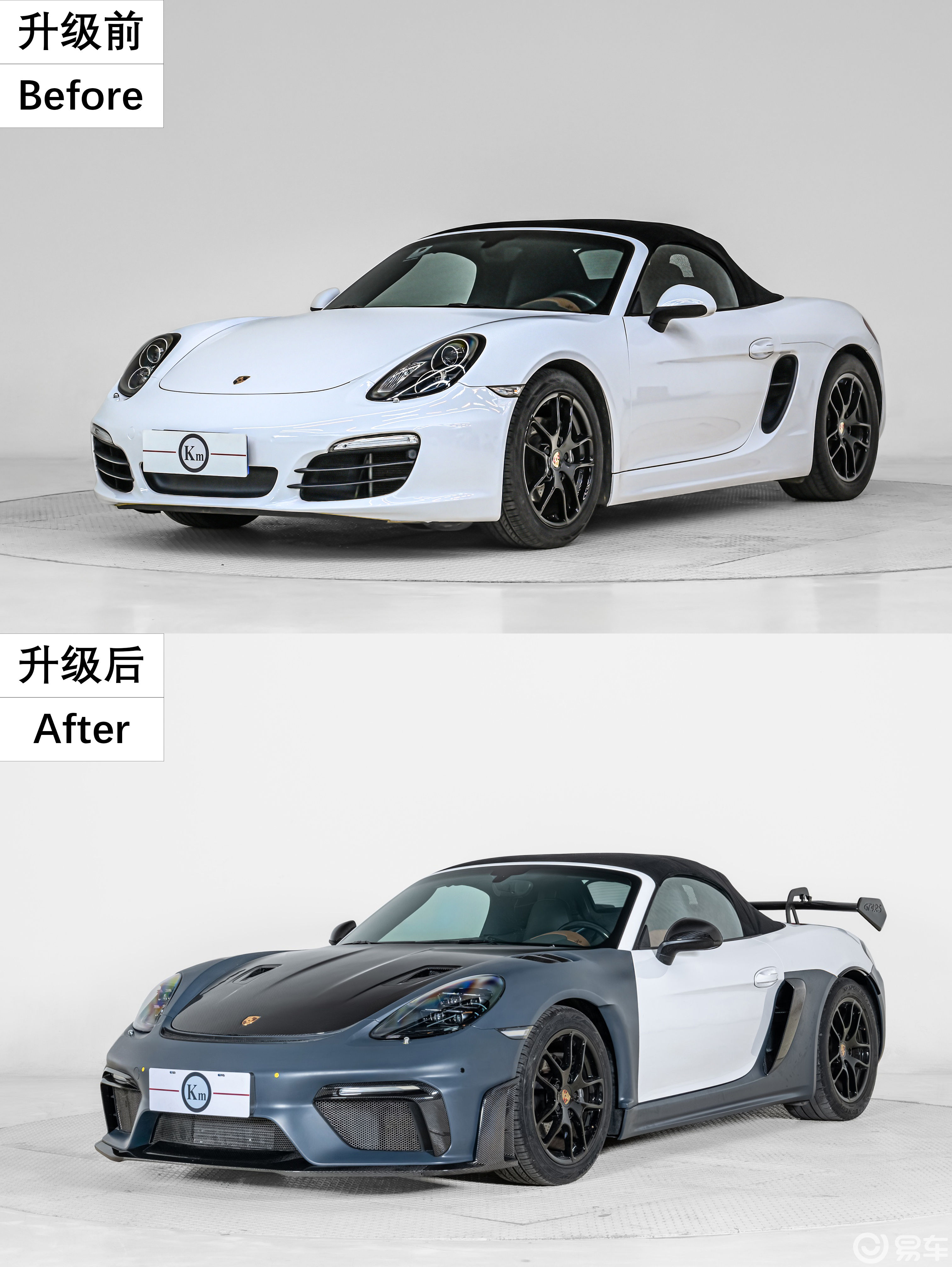 作为保时捷旗下的一台入门跑车,Cayman与Boxster(981)的设计理念以运动为核心,低矮、宽大、流畅的外观,俘获了不少想拥有一台赛车车迷的心,基础售价50多万,但要选择购买2025新款718 GTS4 RS,官网价格是150多万。下面我们看如何通过Km改装外观包围配件,让普通的保时捷Cayman与Boxster秒变718 GT4 RS 造型风采。