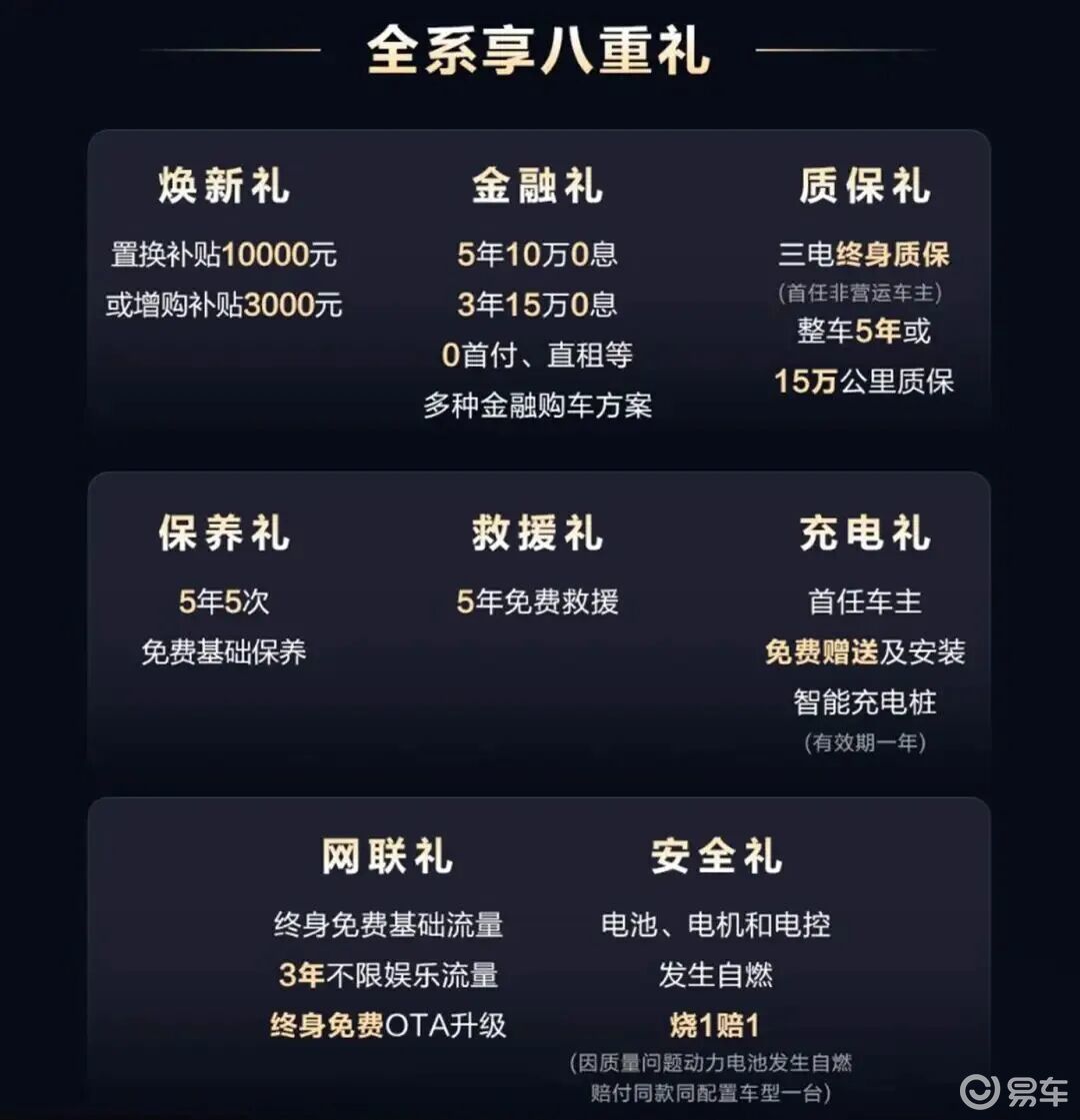 该车同步推出八重尊享礼遇及两项独享权益。焕新礼提供10000元置换补贴或3000元增购补贴,金融礼涵盖5年10万0息、3年15万0息及0首付、直租等多元方案。首任非营运车主可享三电终身质保、整车5年或15万公里质保,同时叠加5年5次免费基础保养与5年免费救援服务。首任车主还能获赠并安装智能充电桩(有效期一年),享受终身免费基础流量、3年不限娱乐流量及终身免费OTA升级,动力电池若因质量问题自燃,可获赔同款同配置车型。独享权益包括,前30位购车用户免费升级百路驰KO3系列轮胎,1月27日至2026年3月31日24点前,在悦野圈APP支付1000元订金可抵扣5000元购车款。
