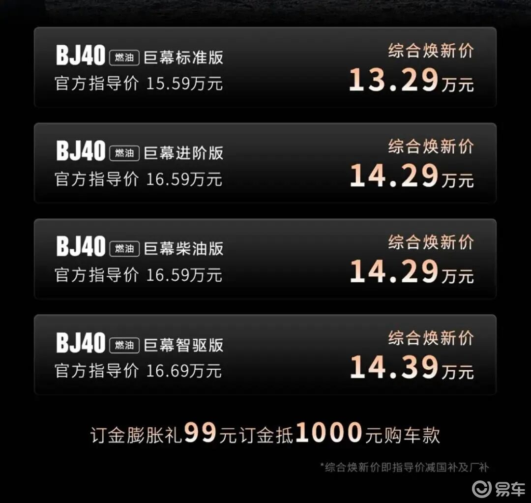 同期上市的BJ40燃油巨幕版定位亲民,官方指导价15.59—16.69万元,综合焕新价低至13.29万元。1月27日下订用户可享受“99元订金抵1000元购车款”的膨胀优惠,同时享有全系七重礼:0首付等多款金融产品、至高8000元置换补贴、转介绍成交推荐人获800元京东卡;3月31日前,现役退役军人、消防员、警察及直系亲属购车可享3000元补贴。首任非营运车主可享受整车5年/15万公里质保、动力总成终身质保、5年5次免费基础保养及5年免费道路救援服务。