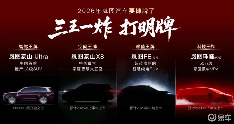 2026年1月28日,岚图汽车重磅发布2026年产品计划,抛出了被内部称为“三王一炸”的重磅布局——推出四款全新车型,覆盖SUV、FUV、MPV三大主流品类,且全系标配L3级智能驾驶硬件。这场密集的新品攻势,既是岚图产品线的全面扩张,也是其针对高端新能源市场格局的精准卡位。在L3级智驾步入商业化前夜、细分市场竞争白热化的当下,这份激进的规划究竟是洞察行业趋势的战略远见,还是可能分散资源的危险豪赌,值得行业审慎看待。