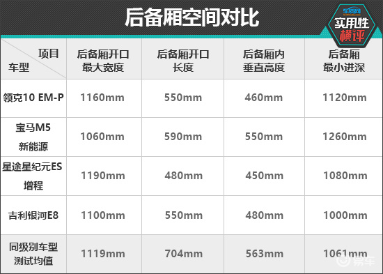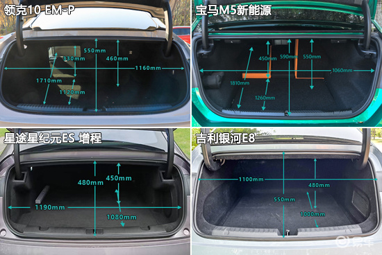 后备厢方面,四款车型的内部造型均较为规整。实测来看,领克10 EM-P和星途星纪元ES整体表现较好,分别有两项数值超过了同级别车型测试均值。相比之下,吉利银河E8所有测试数值均未达到同级别车型测试均值,存在提升空间。