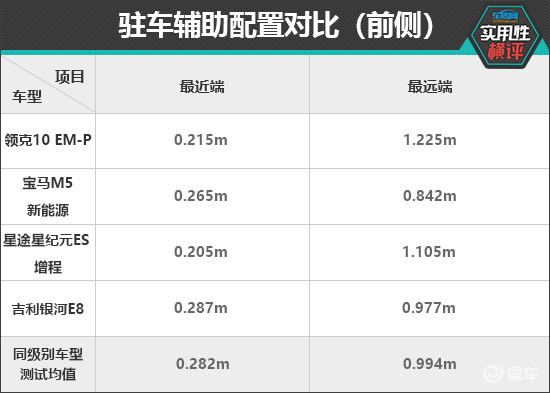驻车辅助配置方面,在前驻车雷达测试中,领克10 EM-P最远探测距离达到1.225m,雷达功率在四款车型中处于领先水平。在最近提示距离方面,吉利银河E8与同级别车型测试均值更为接近,表现好于其他三款车型。