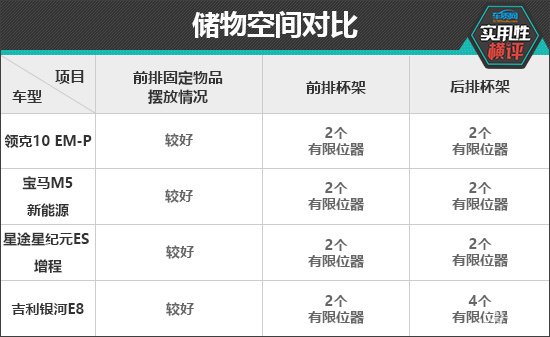 杯架测试环节,吉利银河E8全车提供6个杯架,数量相对较多,另外三款车型的杯架数量均为4个。值得肯定的是,四款车型前后排杯架均带有限位器,可以有效固定水杯或水瓶。