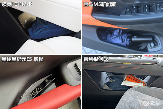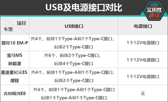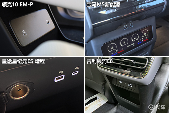 充电接口方面,宝马M5新能源全车配备6个USB接口,数量领先于另外三款车型,不过由于其仅提供Type-C一种类型,兼容性较差。兼容性方面表现最好的是吉利银河E8,前后排接口涵盖Type-A和Type-C两种类型。而领克10 EM-P和星途星纪元ES表现一致,前排提供1个Type-A接口和1个Type-C接口,后排配备2个Type-C接口。此外,除吉利银河E8外,另外三款车型均配备1个12V电源接口,可以满足日常用电需求。