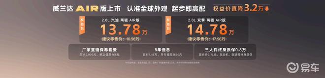 全新换代威兰达AIR版入门即高配,13万元起售价格也是非常有诚意的,提供的厂家兜里质保相当于给消费者吃颗定心丸。