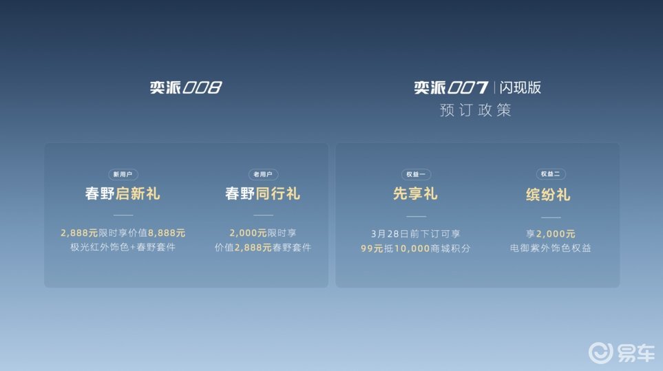 同步推送的OTA升级让奕派008更安全更好玩,新增的爆胎稳行系统可在高速爆胎时保持车身稳定,汽水音乐、爆米花影视、美团的加入,让出行娱乐与生活服务无缝衔接。限时权益同样给力,新用户2888元即可享价值8888元的极光红外饰色+春野套件,老用户仅需2000元就能入手春野套件,将家庭出行的美好边界持续拓宽。